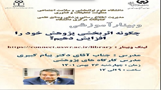 " will be held on February 15 /2023 The educational webinar "How to increase the effectiveness of your research?", will be held on the 26th of Bahman 1401 by the efforts of the medical information and scientific resources management of the University of social welfar and Rehabilitation Sciences (Central Library). Time: from 9 am to 12 pm Techer: Dr. Payam Kabiri link: https://connect.uswr.ac.ir/library